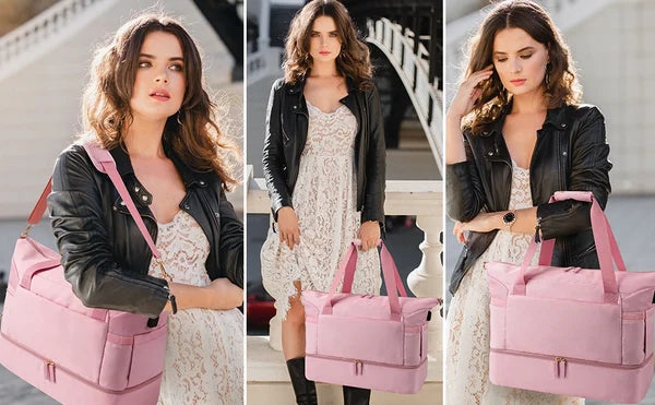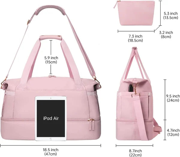 Dry Wet Separate Duffel Bag This duffle bag for women delivers roomy main compartment to store your clothes and items. A zippered waterproof PVC lined pocket for wet clothes or towels and swimsuits. In addition, this travel duffel bag also gives an extra small makeup bag for easy storage.